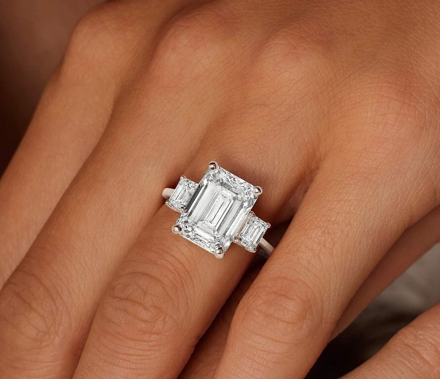 A three-stone setting includes a center diamond with two smaller stones on either side. It represents the past, present, and future of your relationship while enhancing the overall appearance of the center stone.